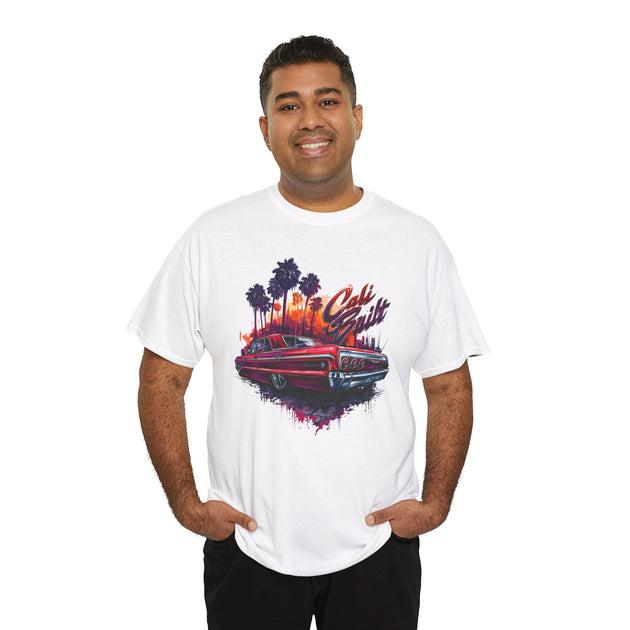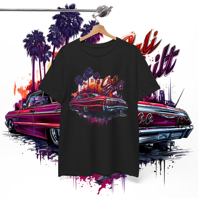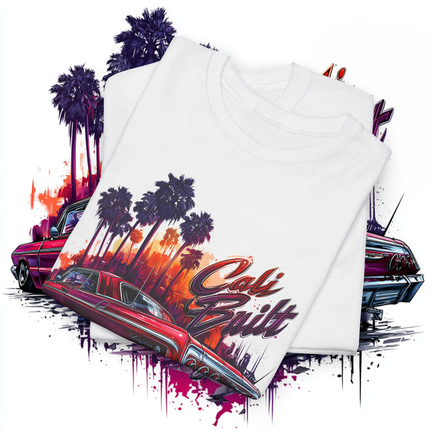 Cruise the West Coast in style with this Cali Built Lowrider T-Shirt, featuring a bold ’64 Impala design, LA palm trees, and a sunset skyline. This graphic tee is perfect for lovers of Chicano culture, lowriders, California pride, streetwear, and classic car art.