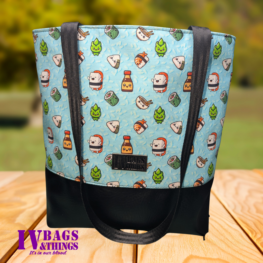 Add some playful charm to your day with this custom-designed large tote featuring our exclusive kawaii sushi-themed canvas! Perfect for carrying your laptop, books, accessories, or even an extra jacket, this spacious bag is both cute and functional. Accented with durable black vinyl for a sleek finish, it's ideal for school, work, or everyday adventures. Designed and handcrafted by IV Bags & Things.